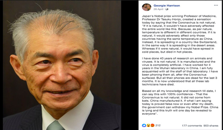 ‘‘মহামারি করোনাভাইরাস প্রাকৃতিক নয়, মানবসৃষ্ট এবং এটি চীনের তৈরি।’’ ২০১৮ সালে চিকিৎসা বিজ্ঞানে নোবলেজয়ী জাপানের ডাক্তার তাসুকু হনজোর বিবৃতি দিয়ে এমনই একটি পোস্ট সামাজিক যোগাযোগ মাধ্যমে ভাইরাল হয়েছে। লম্বা স্ট্যাটাসের সঙ্গে হনজোর একটি ছবিও জুড়ে