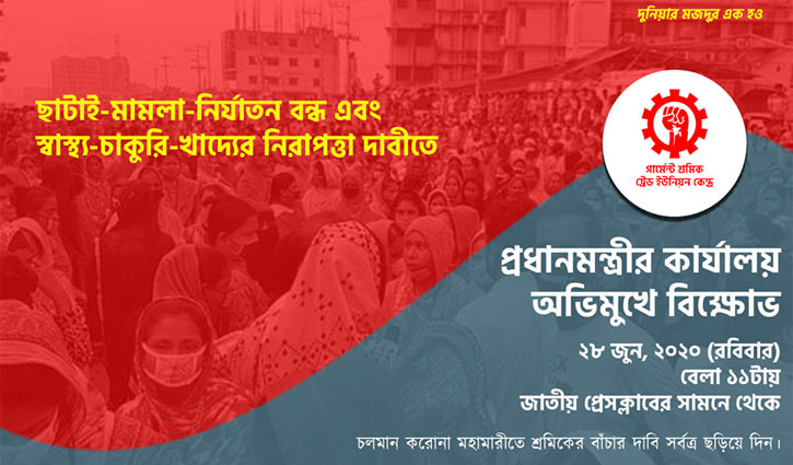 ছাঁটাই-মামলা-নির্যাতন বন্ধ ও স্বাস্থ্য-চাকরি-খাদ্যের নিরাপত্তার দাবিতে রোববার (২৮ জুন) প্রধানমন্ত্রীর কার্যালয় অভিমুখে বিক্ষোভ করবে গার্মেন্ট শ্রমিক ট্রেড ইউনিয়ন কেন্দ্র। শনিবার (২৭ জুন) সংগঠনের সাধারণ সম্পাদক জলি তালুকদার স্বাক্ষরিত এক সংবাদ বিজ্ঞপ্তিতে এই তথ্য জানানো হয়েছে।