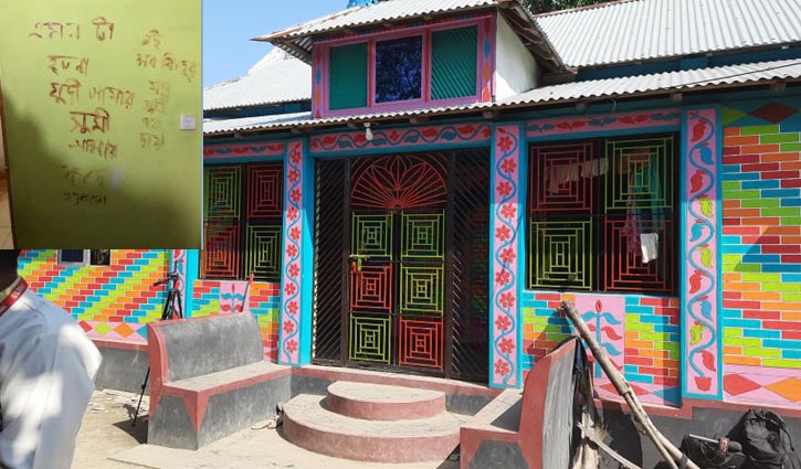 মরদেহ উদ্ধার হওয়া বাসা ও ইনসেটে ঘরের দেয়ালের লেখা