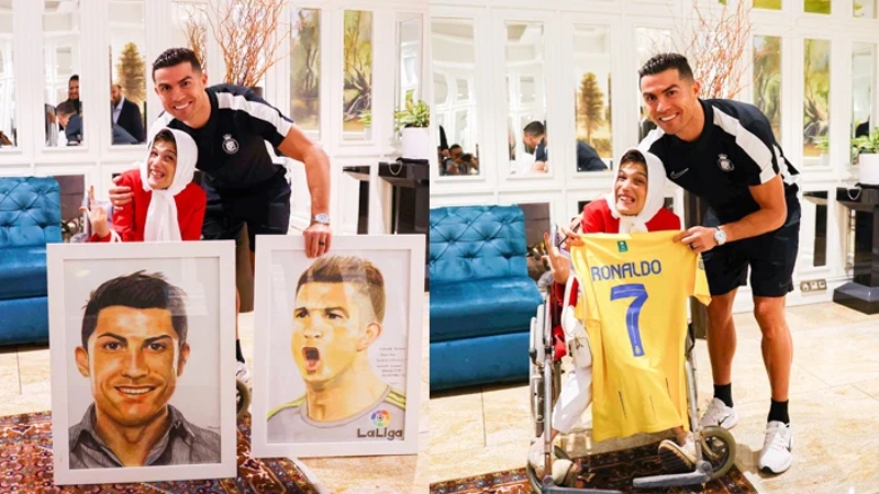 পর্তুগালের তারকা ফুটবলার ক্রিশ্চিয়ানো রোনালদোর ভক্ত-সমর্থক রয়েছে পুরো বিশ্বজুড়েই। তেমনই একজন ইরানের শিল্পী ফাতেম হাম্মামি নাসরাদি। রোনালদোকে নিজের একটি কাজ দেখানোর ইচ্ছে দীর্ঘদিনের, কিন্তু সেই সুযোগটুকু পাচ্ছিলেন না হাম্মামি। অবশেষে সেই শিল্পীর স্বপ্ন পূরণ করলেন আল নাসরের রোনালদো। আরও পড়ুন ঃ